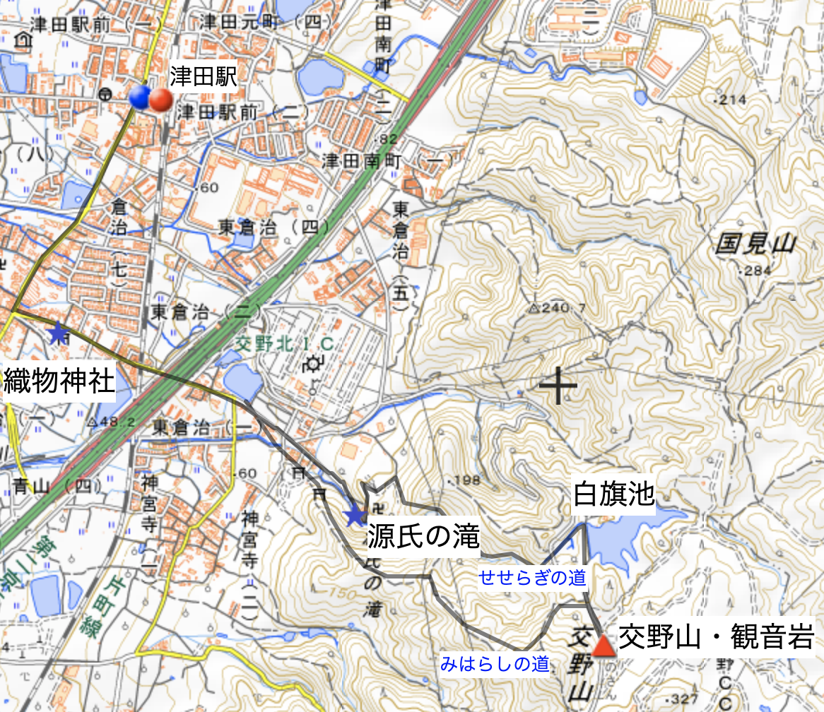 JR津田駅→織物神社→源氏の滝→(せせらぎ道)→白旗池(いきものふれあい里)→交野山・観音岩→(みはらしの道)→JR津田駅 距離:6㎞ 時間:約2時間30分