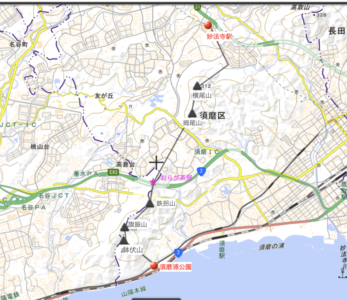 スタート🔴須磨浦公園→▲鉢伏山(はちぶせやま)→▲旗振山(はたふりやま)→鉄拐山(てっかいさん)→▲拇尾山(とがおやま)→▲横尾山(よこおさん)→ゴール🔴妙法寺駅